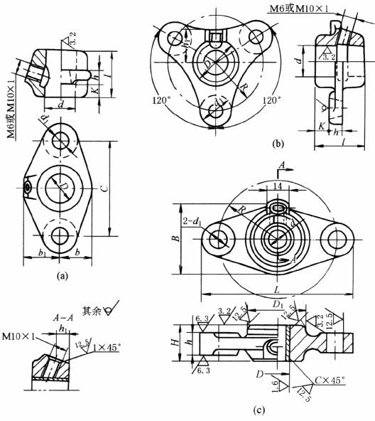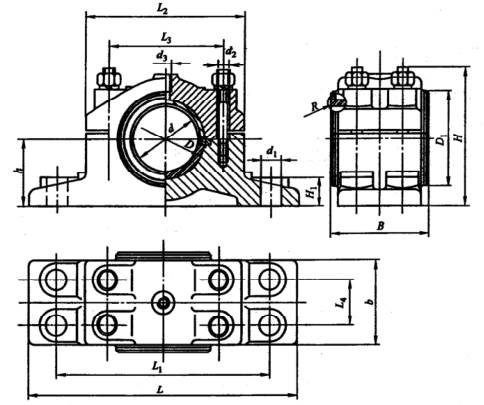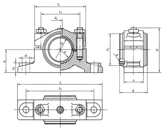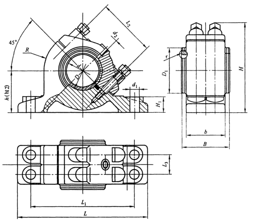 适于环境温度-20~80℃的工作条件。 标记示例:d=80mm的对开式四螺柱斜滑动轴承座:HX080 轴承座 JB/T 2563-2007 |