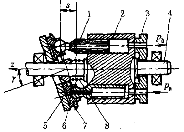![]() 1一柱塞;2一缸体;3一配油盘;4一传动轴;5一斜盘;6一滑靴;7一同程盘;8一中心弹簧 柱塞的头部安装有滑靴,它始终贴住斜盘平面运动。当缸体带动柱塞旋转时,柱塞在柱塞腔内做直线往复运动。柱塞伸出,腔容积增大,腔内吸入油液,称吸油过程。随着缸体旋转,柱塞缩回,腔容积减小,油液通过排油窗排出,称排油过程。缸每转一周,各柱塞腔有半周吸油,半周排油,缸不断旋转,实现连续地吸油和排油 |