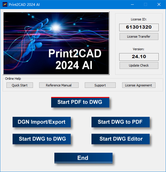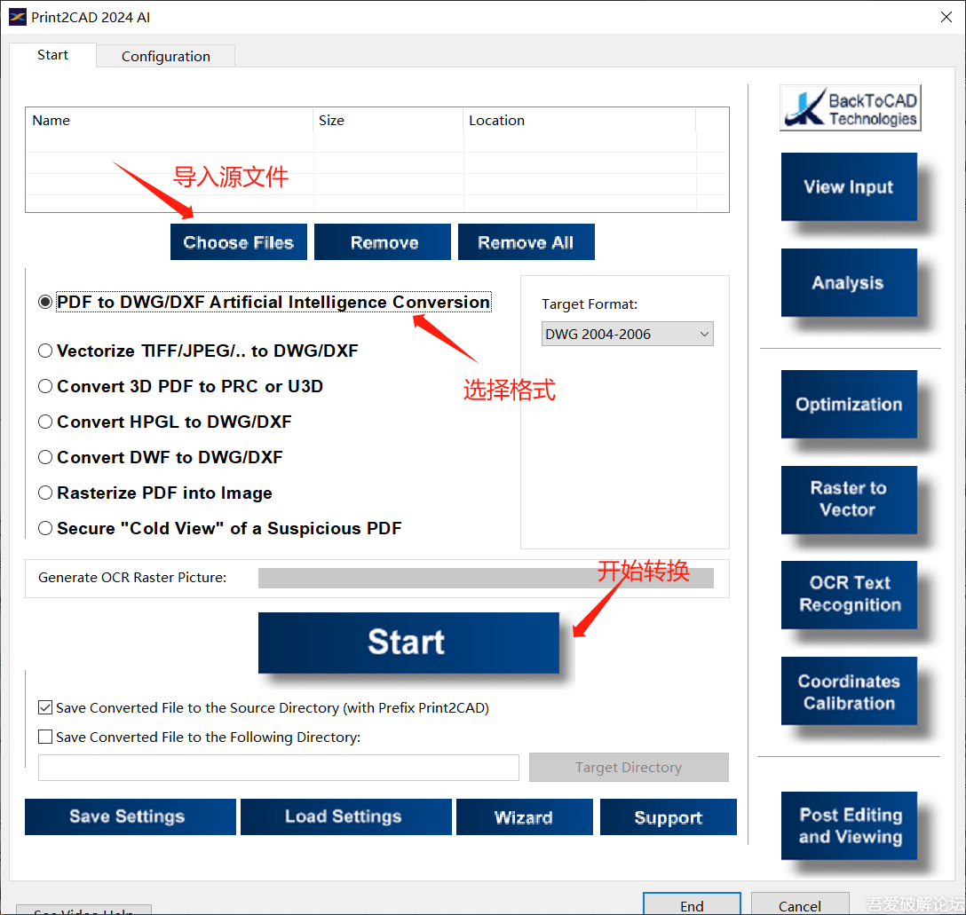 Print2CAD 是一款非常好用且功能强大的文件转换器,不需要安装 CAD 软件就可以独立运行,可以把 PDF、DWF、TIFF、JPEG、PLT(HPGL)和 EPS(PostScript)文件转换成 DWG、DXF 或 DGN 格式文件,然后将其导入到任何版本 CAD 的系统。