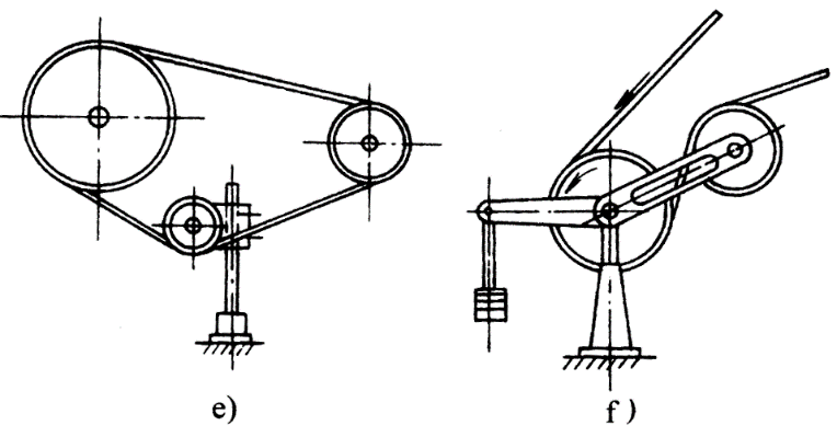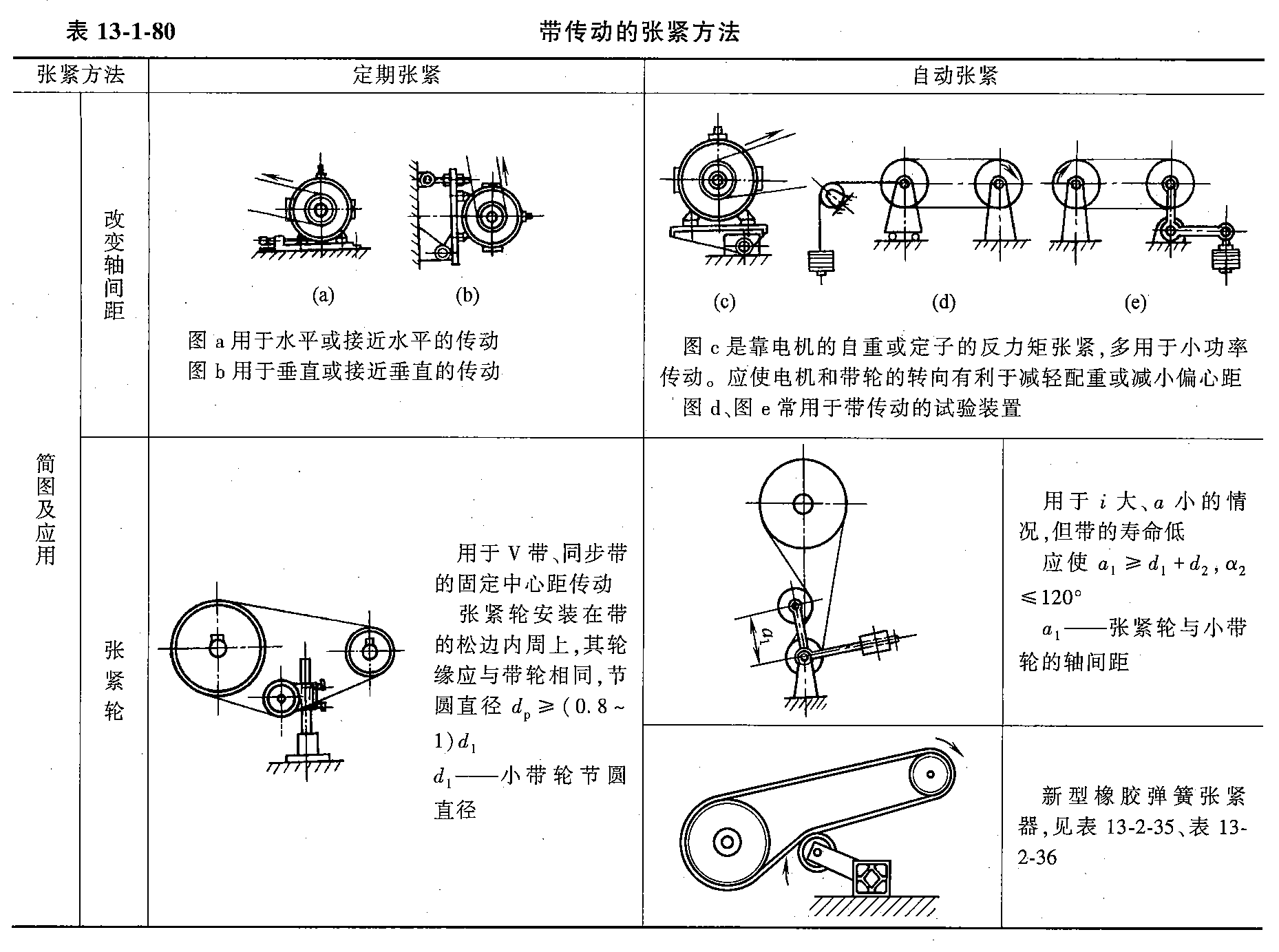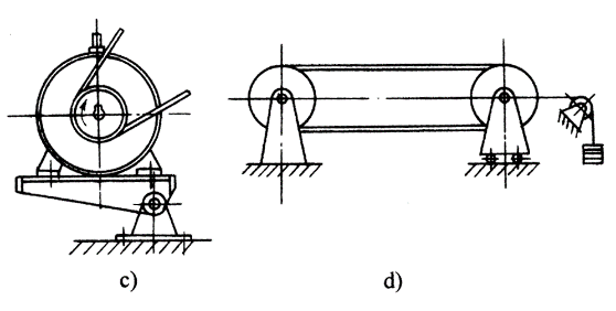 图c是靠电机的自重或定子的反力矩张紧,多用于小功率传动。应使电机和带轮的转向有利于减轻配重或减小偏心距; 图d常用于带传动的试验装置 |