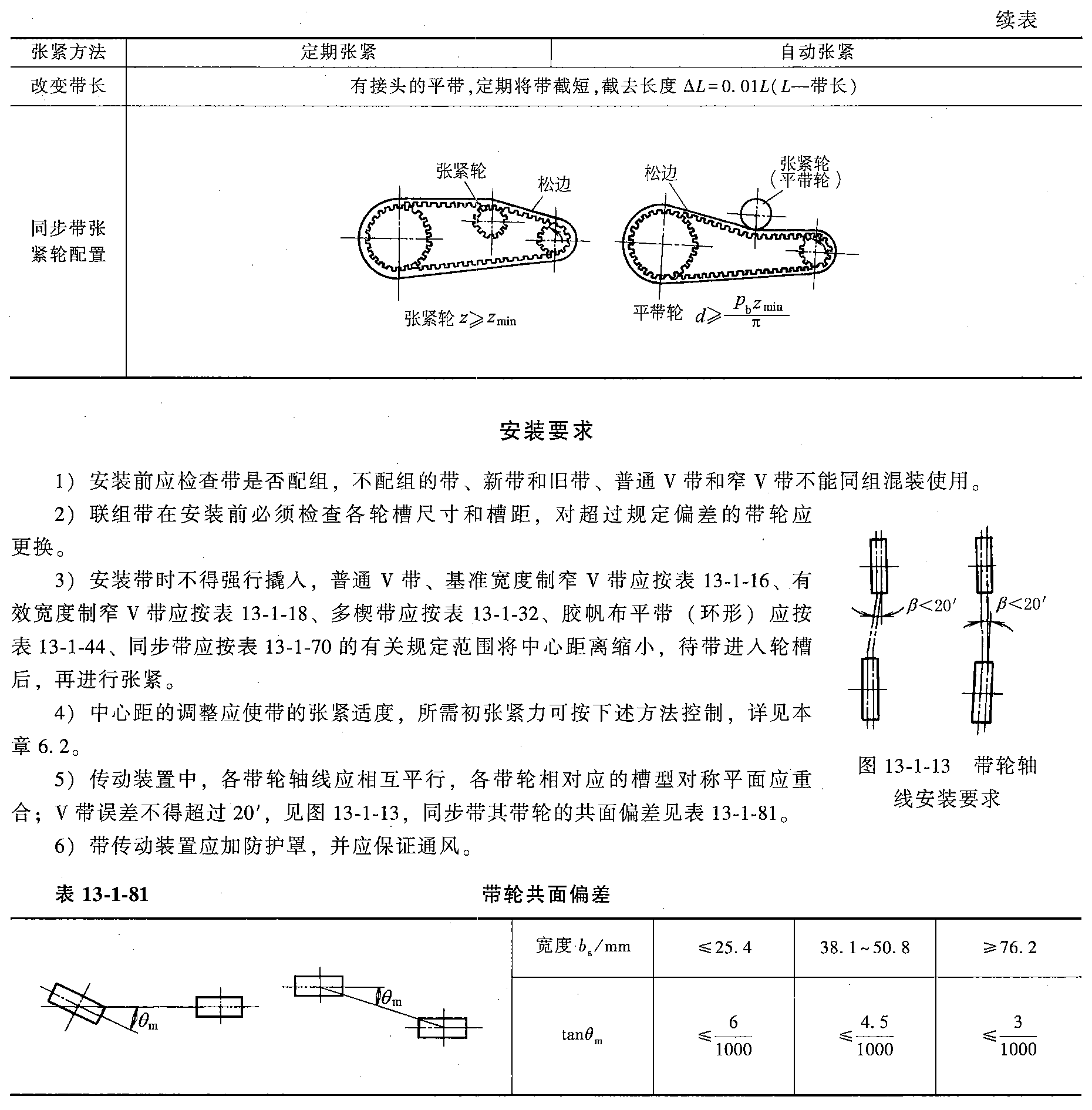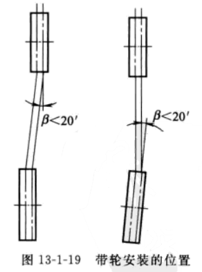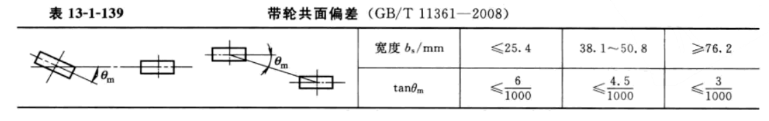 ⑤ 传动装置中,各带轮轴线应相互平行,各带轮相对应的槽型对称平面应重合;V带误差不得超过20',见图13-1-19,同步带带轮的共面偏差见表13-1-139。