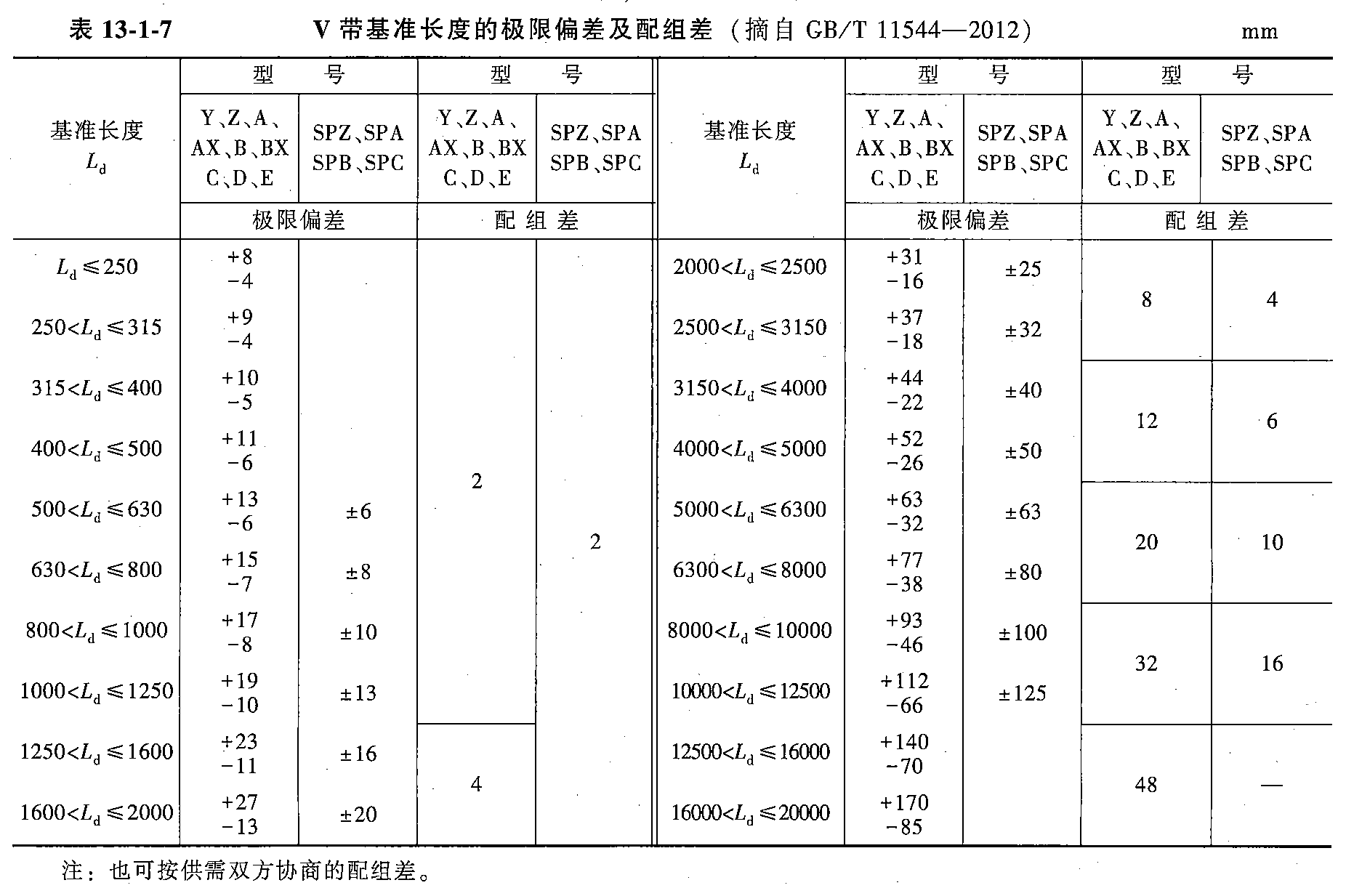 普通V带基准长度的极限偏差及配组差(摘自GB/T 11544-2012)