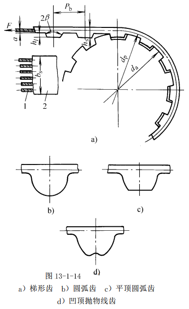 同步带最基本的参数是带齿节距pb (见图 13-1-14),带齿节距是在规定的张紧力下带的纵截面上相邻两齿对称中心线的直线距离;当带垂直其底边弯曲时,在带中保持原长不变的任意一条周线,其长度称为节线长Lp,为公称长度。