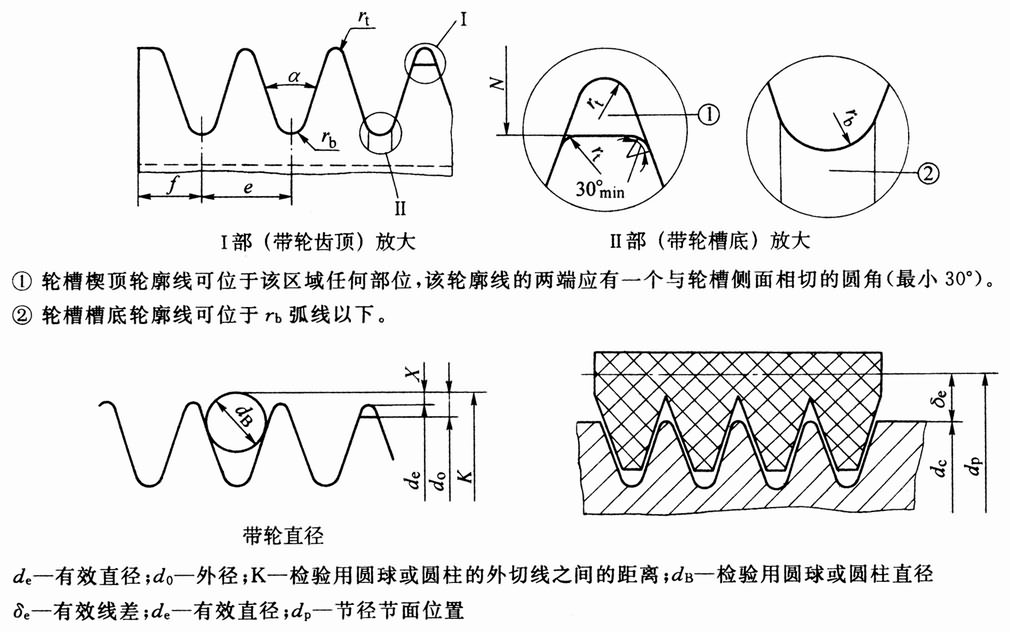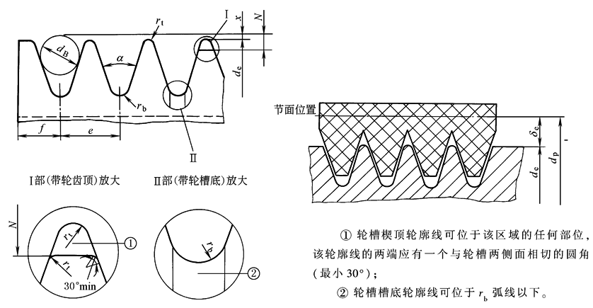 | 型号 | 槽距e | 槽角α | 楔顶圆角半径rb,最小值 | 槽底圆弧半径rt,最大值 | 检验用圆球或圆柱直径dB | 2X,公称值 | 2N,最大值 | f,最小值 | 带轮最小有效直径de | 有效线差公称值δe |