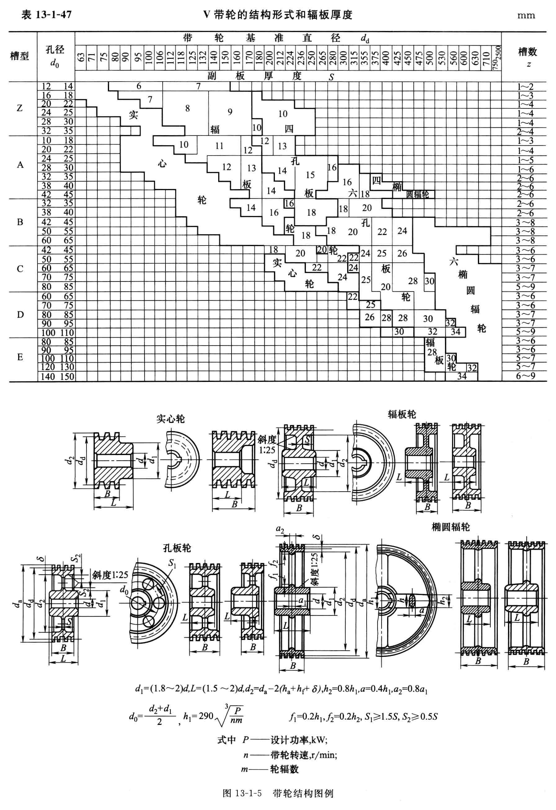 带轮由轮缘,轮辐和轮毂三部分组成。V带轮的直径系列见 表13-1-40、表13-1-41,轮槽截面尺寸见表13-1-42、 表13-1-43,带轮的典型结构形式有实心轮、辐板轮、孔板轮和椭圆辐轮,见表13-1-47和图 13-1-5。