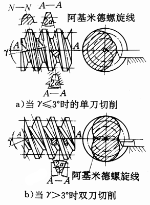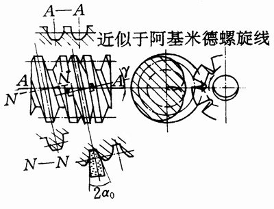 车制,车刀刀刃平面通过蜗杆轴线,这种蜗杆在轴向剖面A—A上具有直线齿廓,法向剖面N一N上齿廓为外凸曲线;而端面上的齿廓曲线为阿基米德螺旋线。磨削时砂轮需经修正,才能磨出正确的齿廓 这种蜗杆加工方便,应用广泛。但导程角大时加工困难,齿面磨损较快。因此,一般用于头数较少,载荷较小、低速或不太重要的传动 |
