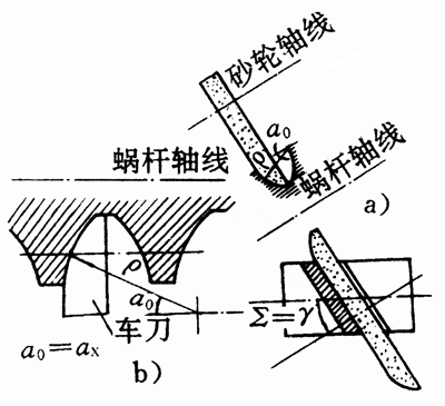 蜗杆齿面一般为凹面的圆柱蜗杆。是用凸圆弧刃的工具加工而成称为齿形C 若是用圆环面砂轮作工具,与蜗杆作螺旋运动,砂轮轴线与蜗杆轴线的交角∑等于蜗杆的导程角γ,这种蜗杆的齿形称为齿形C1(图a);若∑≠γ,其齿形称为齿形C2,如果蜗杆齿面是由蜗杆轴平面上圆弧形车刀车出来的,这种齿形称为齿形C3(图b) 这种传动具有承载能力大,效率高的优点 |