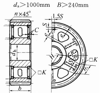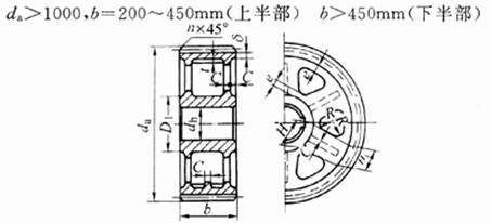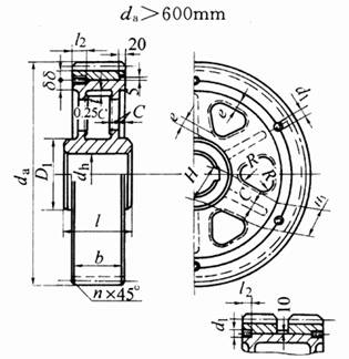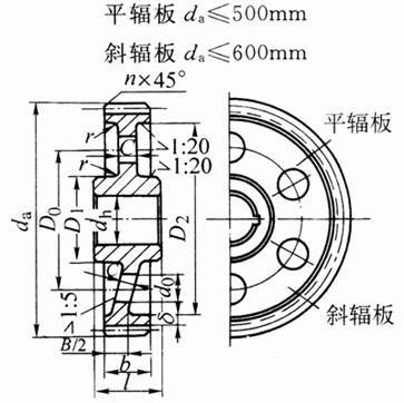 3.对于b≤250mm和直径<1800mm的镶套式齿轮,其轮心可采用单辐板式,辐板厚度由δ到2δ(齿宽越大取较大值)。v>10m/s时,采用单辐板式结构尤为有利。