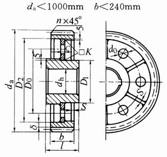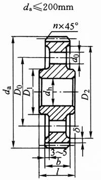 D1=1.6dh l=(1.2~1.5)dh,l≥b δ=(2.5~4)mn,但不小于8~10mm n=0.5mn,D0=0.5(D1+D2) d0=10~29mm,当da较小时不钻孔 |