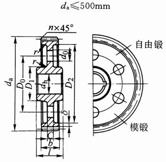D1=1.6dh l=(1.2~1.5)dh,l≥b δ=(2.5~4)mn,但不小于8~10mm n=0.5mn r≈0.5C D0=0.5(D1+D2) d0=15~25mm C=(0.2~0.3)b,模锻; 0.3b,自由锻 |