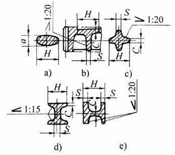 a)椭圆形,用于轻载荷齿轮,a=(0.4~0.5)H b)T字形,用于中等载荷齿轮,C=H/5,S=H/6 c)十字形,用于中等载荷齿轮,C=H/5,S=H/6 d)、e)工字形,用于重载荷齿轮,C=S=H/5 |