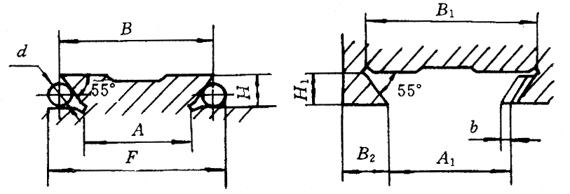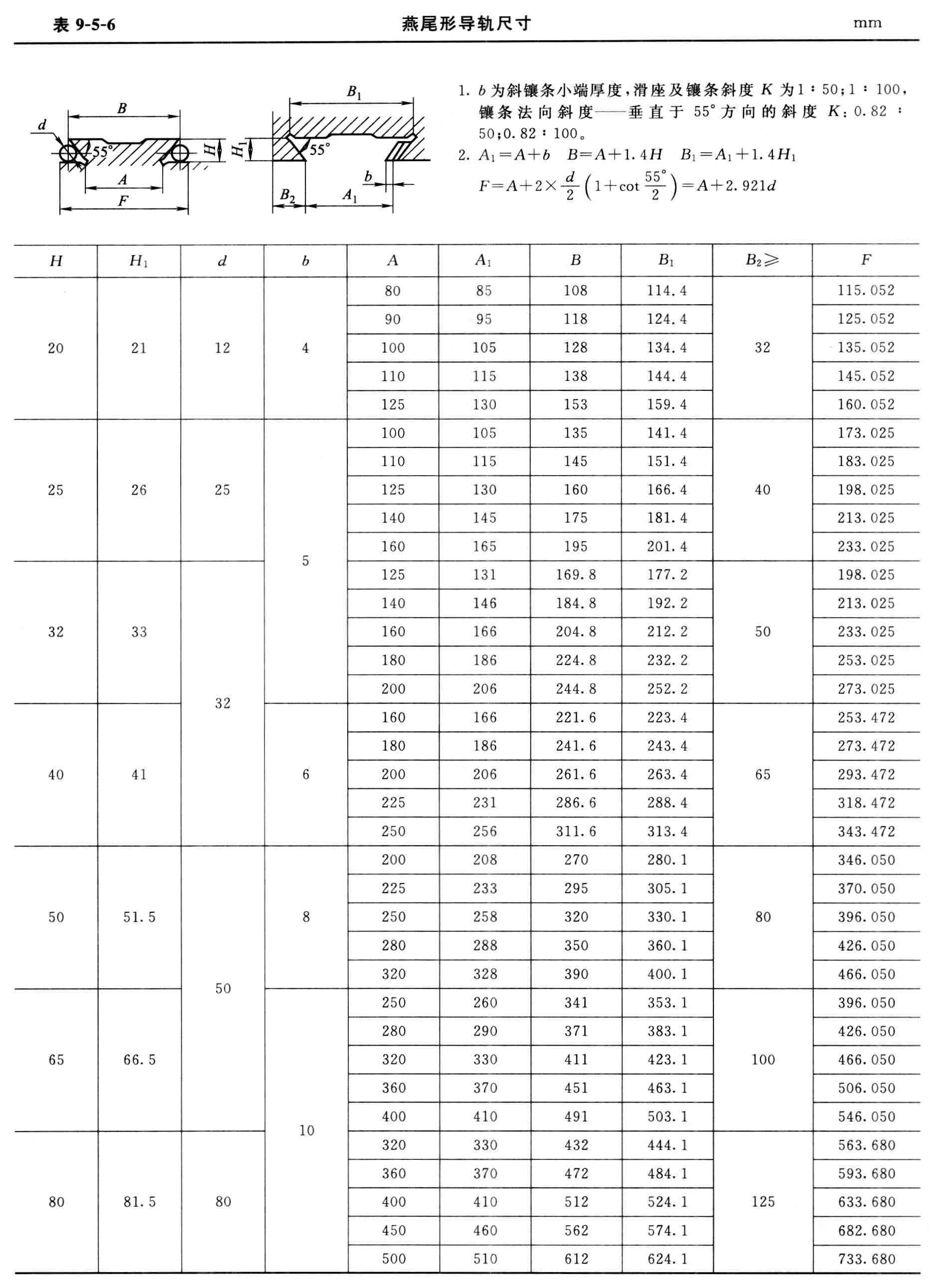 1.b为斜镶条小端厚度,滑座及镶条斜度K为1﹕50;1﹕100,镶条法向斜度──垂直于55°方向的斜度K:1.82﹕50;0.82﹕100。 2.